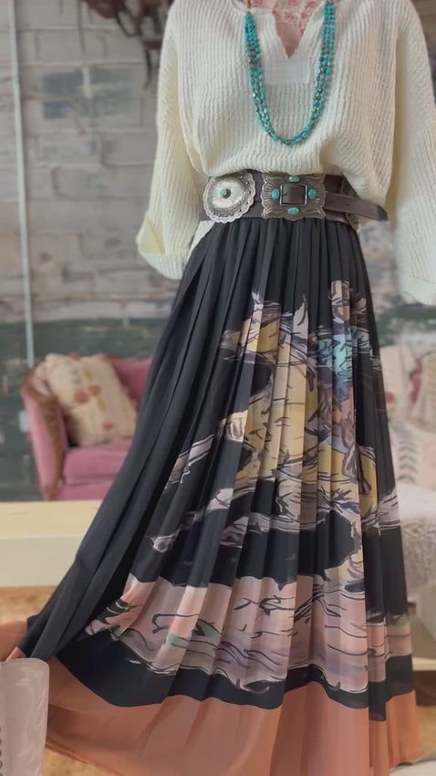 Maxi style, elastic waistband making it comfortable, black base with gorgeous multi-color details throughout.